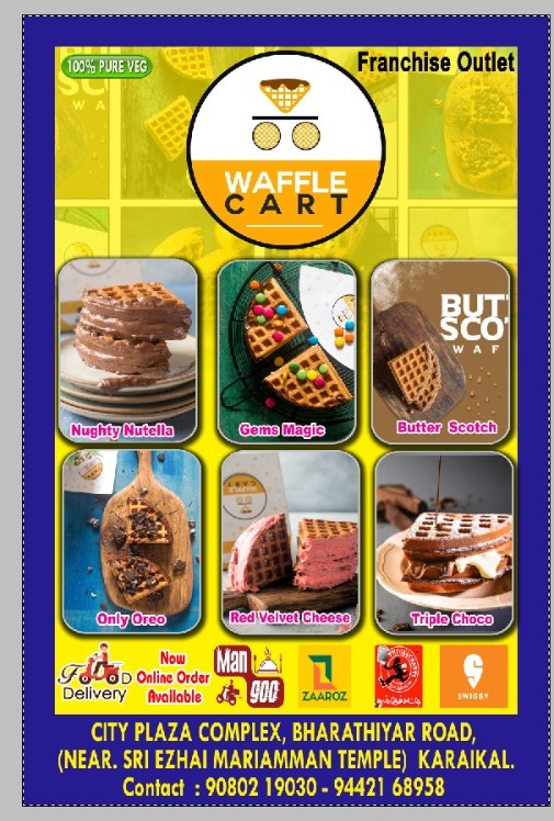Welcome to Waffle Cart, an inviting spot nestled on Bharathiyar Road in Karaikal, Puducherry. This eatery offers an extensive range of delectable waffles alongside a selection of snacks and milkshakes, all crafted to satisfy your cravings.